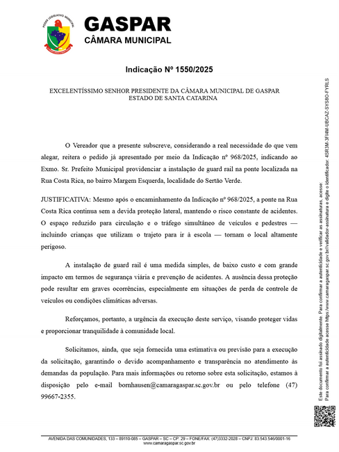 O Vereador que a presente subscreve, considerando a real necessidade do que vem alegar, reitera o pedido já apresentado por meio da Indicação n° 968/2025, indicando ao Exmo. Sr. Prefeito Municipal providenciar a instalação de guard rail na ponte localizada na Rua Costa Rica, no bairro Margem Esquerda, localidade do Sertão Verde.