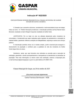 Solicitamos, ainda, que seja fornecida uma estimativa ou previsão para a execução da solicitação, garantindo o devido acompanhamento e transparência no atendimento às demandas da população. Para mais informações ou retorno sobre esta solicitação, estamos à disposição pelo e-mail bornhausen@camaragaspar.sc.gov.br ou pelo telefone (47) 99667-2355.
