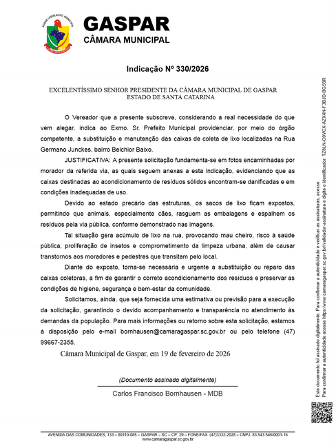 O Vereador que a presente subscreve, considerando a real necessidade do que vem alegar, indica ao Exmo. Sr. Prefeito Municipal providenciar, por meio do órgão competente, a substituição e manutenção das caixas de coleta de lixo localizadas na Rua Germano Junckes, bairro Belchior Baixo.